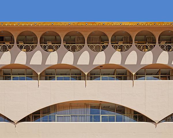 The long horizontal buildings of pink stucco walls and scalloped balconies gracefully link the crowns of three separate hills. Using simple materials, the circular patterns of the civic center harmonize, blend and flow throughout.